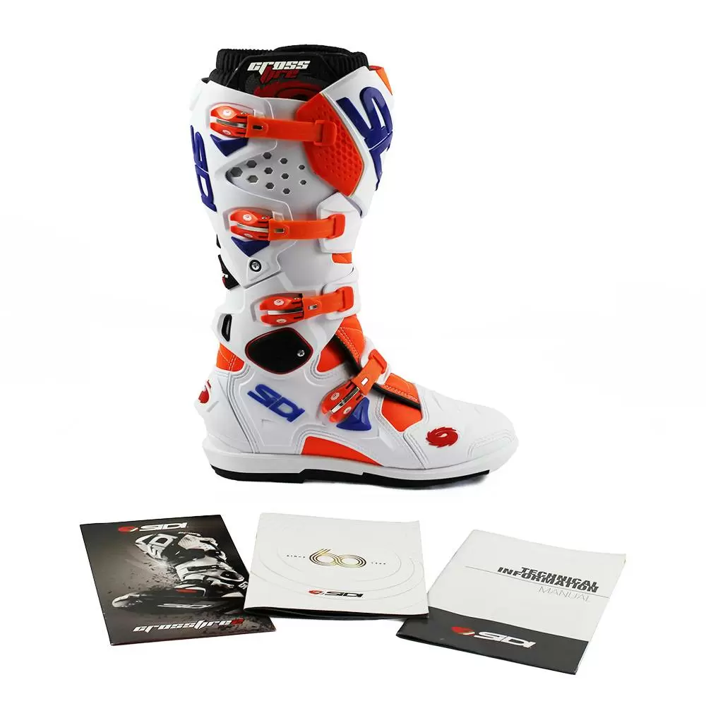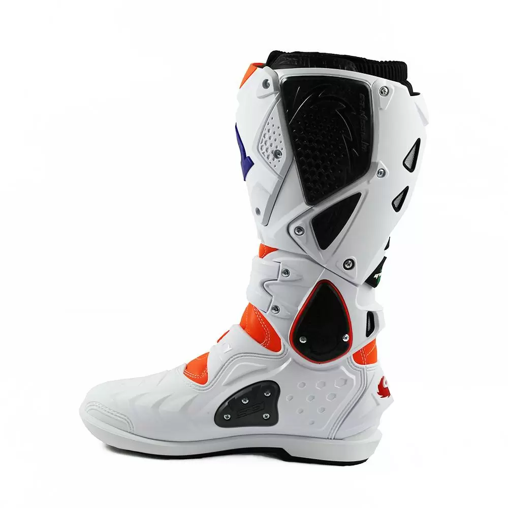 Sidi Crossfire 2 SRS Boots in Orange fluo White by Sidi®. The Sidi Crossfire 2 SRS boots are a premium off-road boot that offers more adjustability to accommodate wider calves and redesigned buckles that are easier to operate with a gloved hand. The Sole Replacement System (SRS) is a bolt-on sole design that enables a rider to swap worn soles themselves and configure the boot for different applications such as supermoto or enduro. These motocross boots are a masterful combination of protection and comfort that are worth every penny!